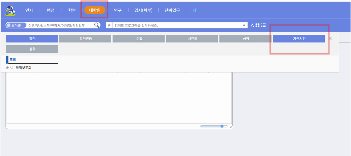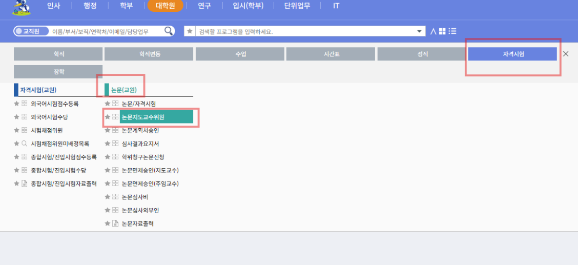 : 논문지도교수의 차세대포털시스템 → 종합정보 → 대학원 → 자격시험